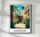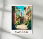 Moroccan poster illustrating a lush traditional courtyard with a view of a Moroccan minaret. Perfect for creating a wall atmosphere inspired by travel and oriental architecture.