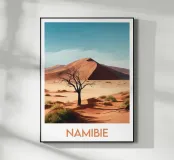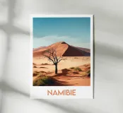Poster artistico della Namibia che illustra un albero solitario nel deserto del Namib, con dune maestose e un cielo limpido. Perfetto per una decorazione murale minimalista e ispiratrice.