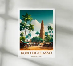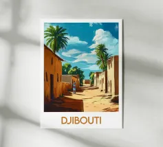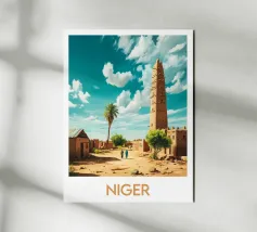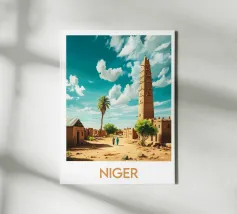 Poster artistico del Niger che illustra una scena di villaggio saheliano con un'alta moschea a banco, abitazioni tradizionali e un cielo luminoso. Una decorazione murale calda e autentica, ispirata all'Africa occidentale.