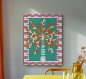 Un ramo stilizzato con foglie verdi e tre arance brillanti è disposto in un vaso a righe bianche e blu, in una natura morta semplice e grafica.