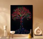 Quest'opera d'arte ipnotica raffigura un albero della vita illuminato da una vibrante e intricata rete di luci, che simboleggia l'interconnessione di tutti gli esseri viventi e il flusso di energia nell'universo. Le radici si immergono in un regno luminoso e ultraterreno, mentre i rami si protendono verso il cosmo e ogni ramo e radice pulsano di un colore unico e radioso. Questo pezzo è una celebrazione della natura, della tecnologia e dell'energia spirituale che ci lega tutti. È perfetto per tutti coloro che amano l'arte unica, colorata e ricca di spunti di riflessione.