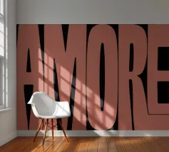 Design tipografico con la scritta "AMORE" in caratteri cubitali, leggermente arrotondati, su sfondo nero. Il colore rosso-marrone chiaro delle lettere crea un contrasto moderno e accattivante e un chiaro impatto visivo.