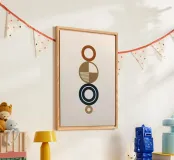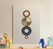 Una composizione astratta pulita e rilassante, caratterizzata da una pila verticale di cerchi e anelli concentrici, che crea un moderno look "totem". La tavolozza è decisamente terrosa e sofisticata e utilizza i toni caldi dell'arancione bruciato/terracotta, del marrone moka, del beige e di un profondo blu navy. Il cerchio centrale è suddiviso in colori pieni, bianco e una sezione di linee orizzontali bianche. Su un morbido sfondo bianco sporco, questo pezzo incarna un'estetica Mid-Century Modern con un tocco bohémien contemporaneo. Questo download digitale di alta qualità (7000x5000 pixel, 300 dpi) garantisce una qualità di stampa superiore.