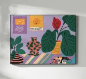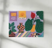 Un angolo accogliente pieno di piante da appartamento, libri sulle vacanze e oggetti decorativi. La scena cattura l'essenza di una casa moderna e bohémien, piena di vita e personalità.