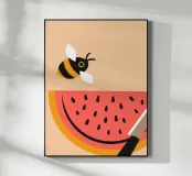 Un fresco mix di anguria succosa e api indaffarate! Questo disegno mostra la bellezza di una succosa anguria e delle api che le ronzano intorno.