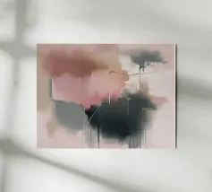 Un delicato pezzo floreale astratto con una forma centrale simile a un fiore in bianco e rosa tenue, con linee più scure simili a inchiostro che si irradiano verso l'esterno, come se svelassero l'anima di un fiore su uno sfondo tenue. Stile Melissa Herrington.