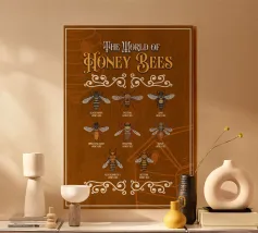 Questa grafica colorata mostra nove diverse specie del genere Apis, amorevolmente presentate come la "Squadra Apis". Ogni ape è illustrata in dettaglio ed etichettata per nome: Apis andreniformis, dorsata, laboriosa, nigrocincta, florea, koschevnikovi, mellifera e cerana. Al centro, un alveare stilizzato. La scritta "Nature's Sweetest Workers" sottolinea l'importanza di queste api per l'ambiente. Lo sfondo punteggiato in arancione caldo sottolinea il design amichevole e informativo.