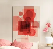 Una composizione audace e modernista in cui la geometria incontra il sentimento: cerchi e rettangoli sovrapposti nei toni del cremisi e del corallo formano un ritmo visivo al tempo stesso strutturato ed espressivo. Questo pezzo evoca la chiarezza del Bauhaus con un tocco di calda astrazione, perfetto per gli interni che abbracciano l'equilibrio, il colore e la semplicità concettuale.