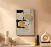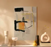 Un'espressiva composizione astratta costruita con audaci forme nere, morbidi strati grigi e caldi accenti di giallo e ocra. Gesti lineari e forme frammentate suggeriscono un ritmo architettonico sospeso tra struttura e intuizione. L'opera trasmette equilibrio attraverso la tensione, rendendola adatta a interni contemporanei, stampe su larga scala e contesti editoriali o gallerie moderne.