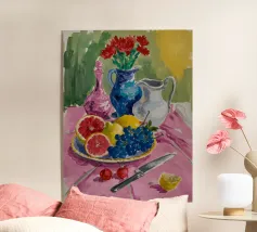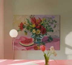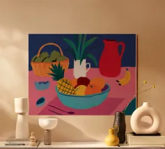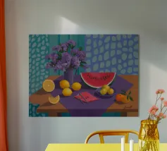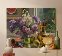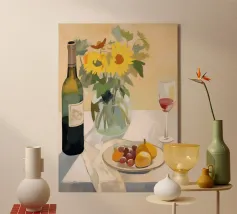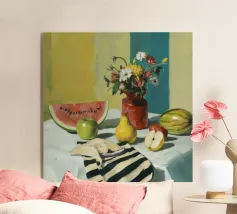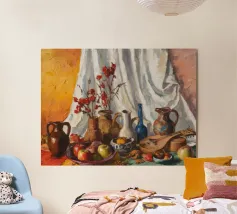 Una natura morta rustica e calda con una chitarra, una brocca, un'anguria e dell'uva. La composizione evoca un senso di vita di campagna piacevole e creativa, con toni caldi e terrosi e una disposizione rilassata e armoniosa.