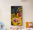 A beautifully chaotic still life of an artist or crafter table, with scissors, fruit, and other objects. The rich colors and dynamic composition celebrate the beauty in creative mess.