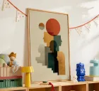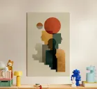 This minimalist Bauhaus-inspired composition layers geometric human silhouettes into a rhythmic vertical arrangement. Flat planes of ochre, terracotta, charcoal, and muted beige intersect with bold circular forms, creating a striking balance of harmony and tension. The textured surfaces soften the strict geometry, evoking both architectural solidity and organic imperfection. By stacking profiles like steps ascending toward the large red sun, the artwork suggests growth, dialogue, and collective evolution. Printed at 300 DPI in gallery quality, it is designed to transform any modern interior wi