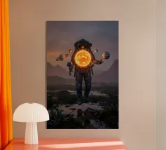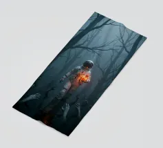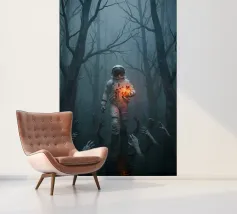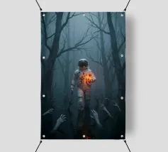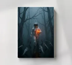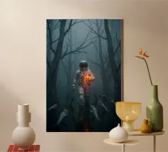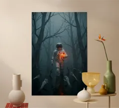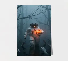 Questa opera d'arte oscura e cinematografica fonde fantascienza e orrore in una potente scena surreale. Un astronauta attraversa una foresta nebbiosa e infestata, circondato da mani inquietanti che emergono dall'acqua sottostante. Nella sua mano, un cuore incandescente proietta una luce calda contro la fredda atmosfera blu, simboleggiando la speranza, l'umanità e la sopravvivenza nell'ignoto. L'illuminazione tetra, gli alberi nebbiosi e il contrasto drammatico creano una storia visiva intensa ed emozionante. Perfetto per gli appassionati di dark fantasy, space art, temi psicologici e decorazioni murali d'atmosfera, questo disegno aggiunge mistero e profondità.