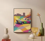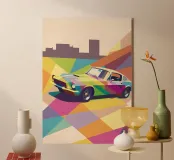 Get an illustration of a classic car with bright colors and a modern geometric style.