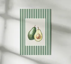 Set on a neutral, cream background, this elegant illustration of the avocado fruit adds sophistication to any kitchen, cafe or dining area. This minimalist yet informative design will spark conversation in any setting, adding a refined touch to your environment.