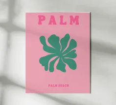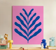 Un poster moderno di ispirazione pop art con il basilico come motivo grafico principale. Le foglie stilizzate di colore verde intenso spiccano sullo sfondo rosa acceso, completate dalla scritta "BASIL" in blu scuro.