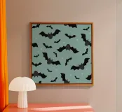 I pipistrelli dei cartoni animati con facce sorridenti volano su uno sfondo blu-verde disseminato di piccole stelle. Il design giocoso crea un'atmosfera stravagante e divertente.