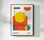 Un poster digitale dinamico e classico che celebra la fondazione del Bauhaus nel 1919. La composizione presenta una disposizione asimmetrica di grandi forme geometriche - cerchi e rettangoli - nell'iconica tavolozza di colori di ispirazione primaria: rosso-arancio, blu e giallo. Le spesse linee nere impongono una struttura chiara, mentre le sottili linee verticali e orizzontali aggiungono profondità e consistenza alle sezioni del disegno. Questo pezzo è un potente esempio di arte modernista minimalista e di ispirazione De Stijl. Questo download digitale di alta qualità vanta 7000x5000 pixel a 300 dpi, garantendo una chiarezza eccezionale e una qualità di stampa superiore.