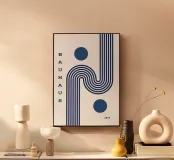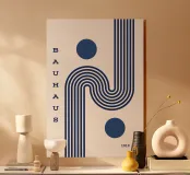 Un esempio straordinario di design grafico Bauhaus del primo periodo del 1919. Questo manifesto minimalista raggiunge il massimo impatto attraverso una geometria semplice ed elegante. Il disegno è caratterizzato da audaci linee parallele di colore blu intenso che confluiscono in una ritmica curva a S o forma di onda, bilanciata da due solidi cerchi blu. Questa composizione ad alto contrasto incarna l'attenzione del Costruttivismo per la struttura lineare e il movimento, rendendola un pezzo di grande effetto senza tempo. È perfetto per aggiungere un ritmo modernista a uno spazio minimalista, scandi o mid century modern. Il testo recita "BAUHAUS 1919". Questo è un file di riproduzione d'arte digitale di alta qualità,