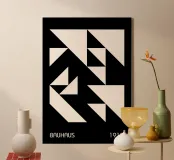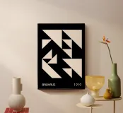 Un poster digitale di grande impatto che celebra la fondazione del Bauhaus nel 1919. Il disegno presenta una composizione astratta e frammentata, dominata da triangoli grandi e piccoli di colore bianco sporco su uno sfondo nero intenso. La disposizione crea un motivo dinamico, visivamente ritmico e altamente geometrico che incarna l'enfasi modernista sulle forme di base e sull'alto contrasto. Questo pezzo geometrico cattura perfettamente lo spirito sperimentale del Modernismo minimalista. Questo download digitale di alta qualità vanta 7000x5000 pixel a 300 dpi, garantendo una chiarezza eccezionale e una qualità di stampa superiore per un grande formato, sophi