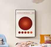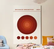 Un magistrale manifesto della mostra Bauhaus del 1923, caratterizzato da uno studio preciso e avvincente della forma concentrica e del colore. Il disegno è dominato da un grande bersaglio centrale composto da cinque cerchi concentrici, che illustrano un bellissimo gradiente di colore monocromatico. Le tonalità passano da una terra d'ombra profonda e bruciata all'esterno a un corallo/pesca chiaro e luminoso al centro. La tavolozza dei colori è ulteriormente definita da cinque piccoli cerchi alla base. Il testo "BAUHAUS EXHIBITION 1923" è inciso in alto. Questa stampa digitale ad alta risoluzione (7000x5000 pixel, 300 dpi) offre una colorazione impeccabile.