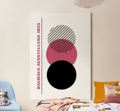 Un manifesto della mostra Bauhaus del 1923 di grande impatto visivo, caratterizzato da un'impilatura verticale minimalista di tre grandi cerchi sovrapposti. La base è un solido cerchio nero, sormontato da un vibrante cerchio rosa lampone e poi da un cerchio bianco riempito da audaci strisce diagonali nere. La sovrapposizione intenzionale crea una tensione visiva e un gioco dinamico tra forma solida, colore e motivo. Il testo "BAUHAUS AUSSTELLUNG 1923" scorre verticalmente a sinistra in rosa. Questa stampa digitale ad alta risoluzione (7000x5000 pixel, 300 dpi) offre una nitidezza impeccabile ed è un pezzo perfetto e di tendenza per qualsiasi negozio di medie dimensioni.
