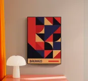 Un manifesto astratto complesso e vibrante nella classica tradizione Bauhaus e De Stijl. Il disegno è un mosaico dinamico di forme geometriche - triangoli, quadrati e quarti di cerchio - che si intrecciano in un motivo ripetitivo. L'audace palette di colori è caratterizzata da un profondo blu navy, da un vibrante rosso corallo e da calde tonalità di pesca/ocra, che creano un ritmo visivo molto coinvolgente. La parola "BAUHAUS" è riportata in basso su una fascia ocra. Questa stampa digitale di alta qualità (7000x5000 pixel, 300 dpi) garantisce linee nitide e colori ricchi, rendendolo un pezzo perfetto per gli spazi modernisti e contemporanei.
