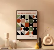 Un poster intricato e dinamico ispirato alla Bauhaus Ausstellung (Mostra) del giugno 1923. Questa opera d'arte presenta una fitta griglia geometrica o mosaico, in cui ogni unità quadrata è riempita di forme astratte, strisce e punti. La composizione presenta un bellissimo mix di verde salvia e terracotta vibrante con elementi in bianco e nero ad alto contrasto. È una dimostrazione magistrale dei principi del Costruttivismo e del Design Modernista. Fornito come poster digitale di qualità superiore (7000x5000 pixel, 300 dpi), garantisce la resa di ogni dettaglio e texture con eccezionale chiarezza. Ideale per aggiungere un
