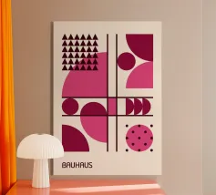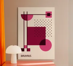 Uno straordinario poster astratto Bauhaus definito da una composizione di pura geometria in una sofisticata palette di rosa e marrone intenso. Il disegno è caratterizzato da grandi cerchi e rettangoli che si intersecano con linee nere decise e un sottile sfondo bianco sporco. Elementi come le barre nere verticali su un semicerchio e le linee orizzontali su un blocco marrone aggiungono una qualità dinamica e strutturata che riflette lo spirito costruttivista. Questo poster digitale viene fornito con una risoluzione superiore di 7000x5000 pixel a 300 dpi, garantendo una stampa eccezionale per i vostri interni contemporanei e chic.