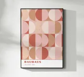 Un manifesto Bauhaus del luglio-settembre 1919, rilassante e sofisticato, caratterizzato da un motivo geometrico dinamico con una moderna texture a terrazzo. Il disegno è un mosaico continuo di cerchi e semicerchi che si alternano su una griglia a scacchiera. La composizione utilizza una tavolozza calda e monocromatica di rosa tenue e polveroso, di rosa fard e di rosso terracotta. La texture del terrazzo maculato è applicata abilmente a varie forme, aggiungendo profondità e un tocco contemporaneo alla classica forma modernista. La parola "BAUHAUS" e la data sono poste semplicemente in basso. Questa stampa digitale ad alta risoluzione (700