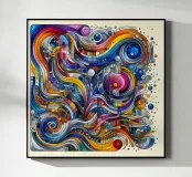 Nel quadro ci sono forme e colori che non si trovano subito. Giocoso e astratto, è un'opera d'arte colorata.