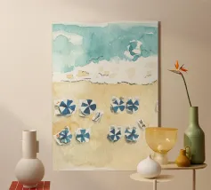 Una suggestiva veduta aerea ad acquerello mostra una vista a volo d'uccello della spiaggia: le dolci onde incontrano la sabbia dorata, mentre alcuni ombrelloni bianchi aggiungono accenti allegri. I delicati colori dell'acqua e la prospettiva minimalista creano una sensazione di estate, di relax e di leggerezza costiera, ideale per le stampe d'arte costiera moderna.