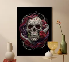 Celebrate Halloween with a stunning portrait of a woman masked as a Calavera, adorned with a floral headpiece. This beautiful drawing captures the essence of Mexican tradition and festivity