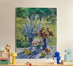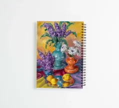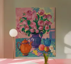 A richly colored still life showcases a vibrant bouquet of purple lavender and white daisies in a blue pitcher, alongside a smaller orange pitcher and bright yellow lemons on a purple draped surface against a warm yellow-orange background, creating a bold and joyful composition.