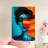 A mysterious face floats in a dynamic colour contrast of cool blue and fiery orange. The figure's closed eyes and gentle smile radiate calm, while a powerful brushstroke in red, yellow and orange divides the face - like a border between two opposing worlds. The flowing textures of hair and skin merge with the background and create a surreal, almost dreamlike atmosphere. The artwork symbolises duality, transformation and the fine balance between different emotions and realities.