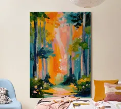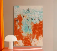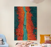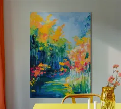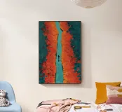 Questa espressiva opera d'arte in stile impasto raffigura uno stretto sentiero turchese che taglia verticalmente i densi campi di arancione infuocato e verde acqua intenso. Le pennellate spesse e scultoree enfatizzano la consistenza e il movimento, creando un potente contrasto tra toni freddi e caldi. Due piccole figure che camminano insieme lungo il sentiero introducono una tranquilla narrazione umana, evocando temi di viaggio, equilibrio e compagnia. La composizione fonde l'astrazione con il paesaggio, trasformando il colore e la texture in un'esperienza visiva emotiva e contemporanea.