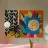 A diptych contrasting a black and white geometric leaf pattern with a colorful abstract composition of blue, orange, and yellow shapes, exploring pattern and color.