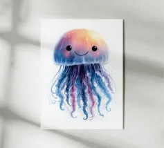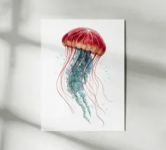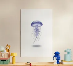 Una raffigurazione mozzafiato di una medusa d'alto mare che si muove alla deriva nelle profondità oceaniche nere come la pece. La sua campana trasparente emana un bagliore pulsante blu e viola, mentre i suoi delicati viticci nastriformi ondeggiano con un movimento aggraziato. Minuscole particelle di luce fluttuano intorno, imitando la bellezza celestiale di un cielo notturno oceanico. Questo dipinto evidenzia la meraviglia surreale delle creature marine bioluminescenti, fondendo il realismo con un'estetica quasi onirica. Il contrasto tra la luce radiosa e i profondi abissi esalta la presenza eterea e ultraterrena della medusa.