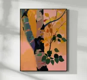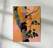 A minimalistic artwork of a single birch tree with colorful leaves, painted in bold, flat tones.