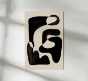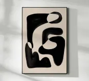 Abstract artwork featuring organic black shapes on a beige background, creating a visually captivating interplay between the positive and negative spaces.