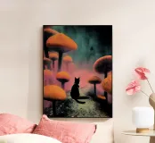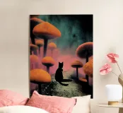 Gatto nero nella mistica foresta di funghi plexiglass