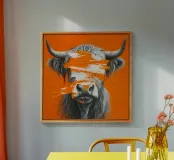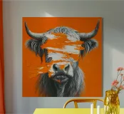 Quest'opera d'arte espressiva mostra la testa di un toro in un dettaglio fotorealistico - parzialmente dipinta con potenti e grossolane pennellate in arancione e bianco. Lo sfondo ad alto contrasto e l'area di colore dinamico sopra gli occhi creano una tensione tra la rappresentazione della natura e l'espressione astratta. Perfetto per interni moderni dal carattere deciso.