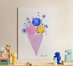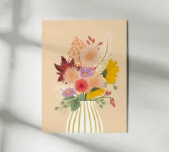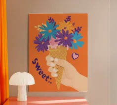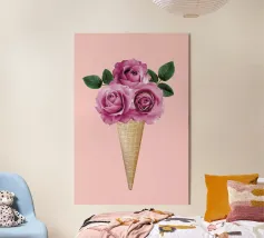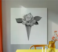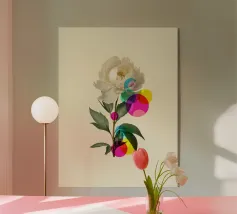 Stravagante arte del collage con un bouquet di rose, peonie e stelle glitterate dorate. Un tocco gioioso e surreale di design a tema floreale e alimentare.