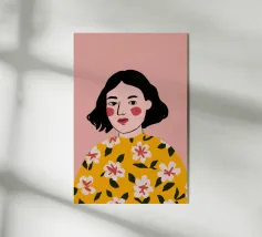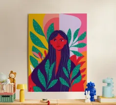 Un'illustrazione vivace e moderna di una donna con gli occhi chiusi, avvolta in un cappotto colorato ispirato alla natura. Le texture audaci e i motivi botanici simboleggiano la forza interiore, l'emancipazione e l'espressione di sé. Quest'opera d'arte irradia calore e fiducia, rendendola perfetta per interni contemporanei, studi creativi o qualsiasi spazio che celebri l'energia e l'individualità femminile.