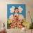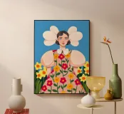 This artwork depicts a person in a dress covered with large, colorful flowers. The background is blue with white clouds, and the person stands amidst a field of flowers, symbolizing growth and beauty.