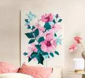 A vibrant and captivating bouquet of pink flowers, beautifully rendered in a contemporary style. The contrasting teal leaves add a touch of sophistication to this stunning floral artwork.