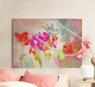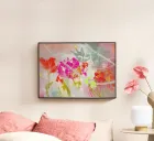 This work of art captures the temporal transience of nature in an impressive way. The vibrant colours of red, pink and orange contrast harmoniously with soft blues and greys in the background. Floral elements appear to dance as they are connected by curved lines, creating a dynamic and joyful movement. The subtle texture brings the colours to life and invites the viewer to discover a world of carefree lightness that celebrates the beauty of nature.
