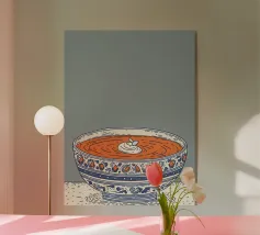 Un campo infinito di fiori grafici nei colori vivaci dell'arancio, del blu e del crema: moderno, giocoso e pieno di energia. La ripetizione ritmica crea una sensazione di infinito e leggerezza. Questo motivo porta il calore dell'estate e una moderna dichiarazione di design in ogni stanza.