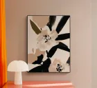 A dynamic floral composition featuring soft blush petals contrasted with bold black strokes and deep olive leaves. The expressive brushwork and graphic contrasts make this piece an elegant yet striking complement to modern, minimalist, or monochrome-inspired spaces.