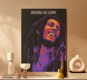 Un ritratto luminoso di un uomo sorridente con i dreadlocks e la citazione "La musica è vita", che cattura la gioia, la positività e lo spirito della musica.